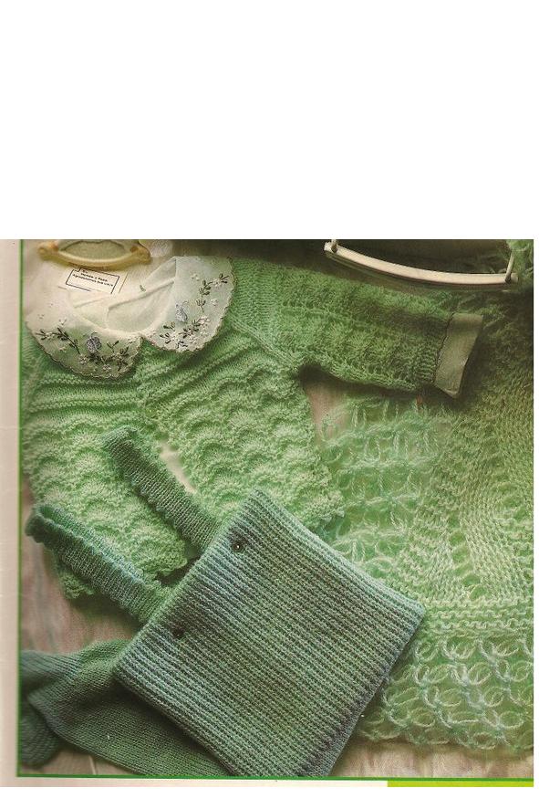 O casaquinho é começado pela pala. Montar 87 pontos e tricotar 1 cm e meio em barra 1/1. Continuar do seguinte modo: 3 p. tricô, 12 p. fant.n°1, laç., 2 m., 1 laç., 9 p. fant. n° 1, laç., 2 m., laç., 31 p. fant. n°1, laç., 2 m., laç., 9 p. fant. n°1, laç., 2m., laç., 12 p. fant. n°1, 3 p. tricô.