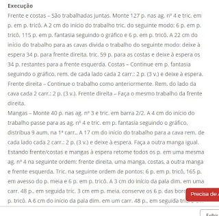 Começar com 50 pontos e ir aumentando até 184 pontos. Dividir 29 frente, 38 manga, 50 costas, 38 manga e 29 frente. Lã grossa e ag. 5 dá...