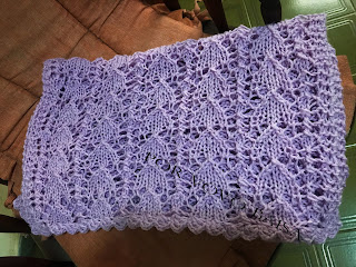 Coloquei 49 pontos e tricotei do início ao fim no ponto fantasia. Acabamento de leque nas bordas.