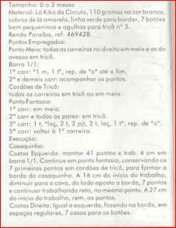 Lã Carinho - ag. 3,0 mm e o modelinho básico, tanto do casaquinho, como do sapatinho e da touca. Foi uma encomenda de urgência...rs.. Aca...
