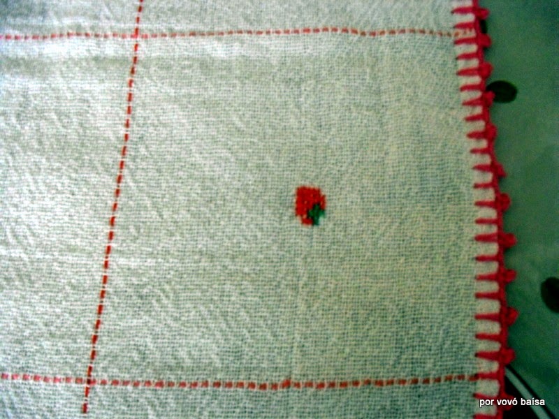 Em quadrados alternados a artesã bordou moranguinhos em Ponto cruz.