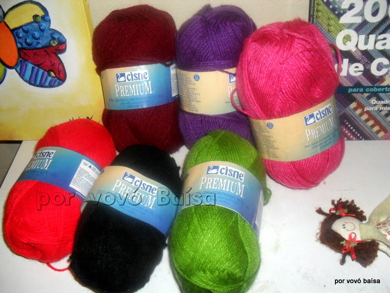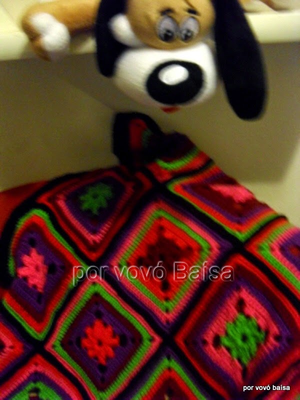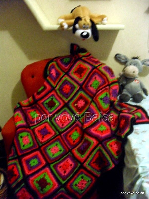 Prá não cansar, fiz os quadrados alternando as cores nas carreiras , porém, mantendo sempre as 5 cores. Emendei com ponto baixo e no final 1 carreira de ponto caranguejo. Gastei 1 novelo e  um tiquinho de outro novelo de cada cor do quadrado. Já do preto foram quase 2 novelos. Conclusão tem que comprar